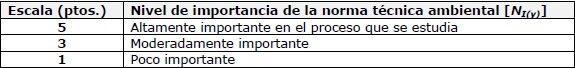 : valor del nivel de importancia “NI ” de la norma técnica ambiental “y” en el proceso “k”, en una escala cualitativa ordinal en las categorías señaladas en la Tabla 3, en puntos
