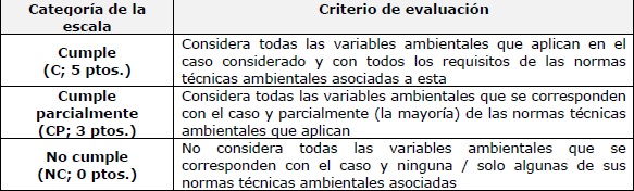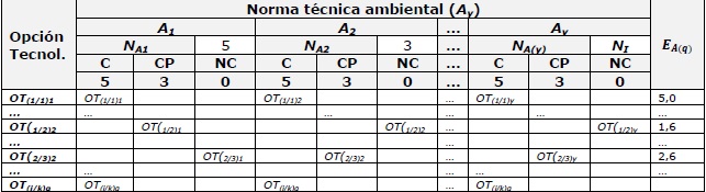 : valoración del cumplimiento de la norma técnica ambiental (Ay )“y” por parte de la tecnología considerada en OTq , en una escala cualitativa ordinal en las categorías señaladas en la Tabla 5, en puntos