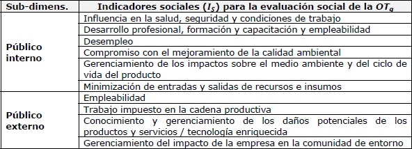La evaluación social de cada opción tecnológica “q”[] consiste en analizar aquellos impactos sociales que directa o indirectamente se pueden provocar derivados de un proceso de transferencia de tecnología, tanto en la PyME manufacturera como en su entorno. Para ello, se ha considerado pertinente una adecuación en el uso de los indicadores para evaluar la Responsabilidad Social (RS), para lo cual se propone hacer uso de la guía publicada por el Consorcio Ecuatoriano para la Responsabilidad Social, Ceres-Ethos 2011[31].