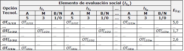 Así, el valor “normalizado” de la Evaluación Social [] para cada opción tecnológica “q” se determina mediante la expresión 7.