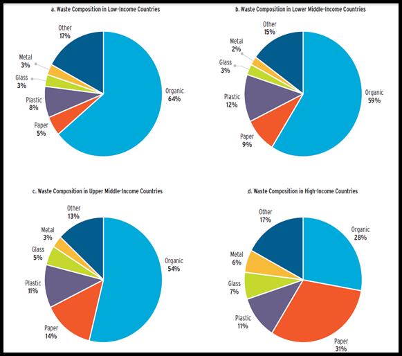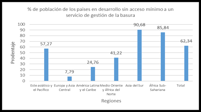 Los desechos se han transformado en un problema mundial, con escasos atisbos de soluciones. "Los municipios de todo el mundo están bajo presión para desviar los residuos sólidos urbanos (MSW) de los vertederos, involucrando una rápida escalada de los costos. En los Estados Unidos, los MSW han aumentado en un 285% de 1960 a 2006, de los cuales los plásticos han tenido la mayor tasa de crecimiento, del 7562%"(Chari, Venkatadri Diallo, 2016: 7). En la figura 1, se puede observar el porcentaje de países en desarrollo sin un acceso mínimo de gestión de residuos (Mavropoulos, 2015). Es evidente que África Subsahariana y el Sur de Asia están con altísimos niveles de falta de gestión de residuos (sobre el 85%).