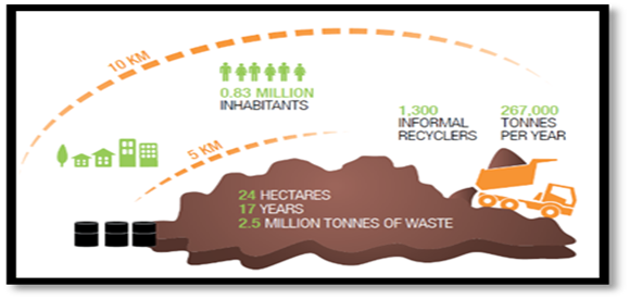 Los países, además de tener el problema de no contar con servicios mínimos para la gestión de residuos, tienen un manejo ineficiente de la basura, una alta incidencia de contaminación en las poblaciones que rodean a los vertederos, gran acumulación de basura y el desarrollo de prácticas informales de gestión. Como advierte el programa de las Naciones Unidas para el medio ambiente, los emplazamientos (estudiados) de depósitos se encuentran en promedio a 5 km de la población civil. Tienen una superficie de 24 hectáreas, una duración media de 17 años, y almacenan una cantidad de 2,5 millones de toneladas de basura, como se presenta en la Figura 2.