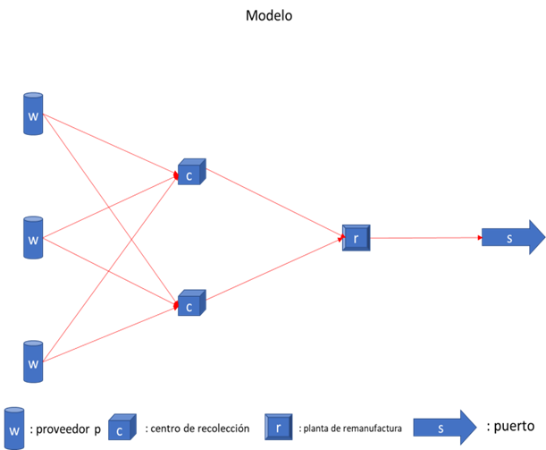 A continuación, se presenta la gráfica del modelo, dónde la w es el proveedor del estanque de combustible, c es el centro de recolección, dónde se separa el estanque de todos sus componentes periféricos. r es el centro de remanufacturización, dónde los equipos son procesados, conforme al proceso de reciclaje que se elegirá. Como última estación, s es el cliente final, que en este punto es el puerto donde se destinará la carga resultante del proceso de reciclaje.