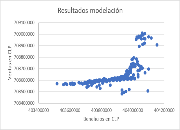 En la solución presentada, se puede observar un frente de Pareto. La propia evolución del algoritmo permitió poder obtener un resultado más representativo y con una solución más evidente, gráficamente. Existe una vasta concentración en distintas ubicaciones del frente, pero, principalmente en el superior derecho como en el centro del gráfico. Esto nos permite concluir que existen soluciones para el modelo, que optimizan sus utilidades y minimizan sus costos.