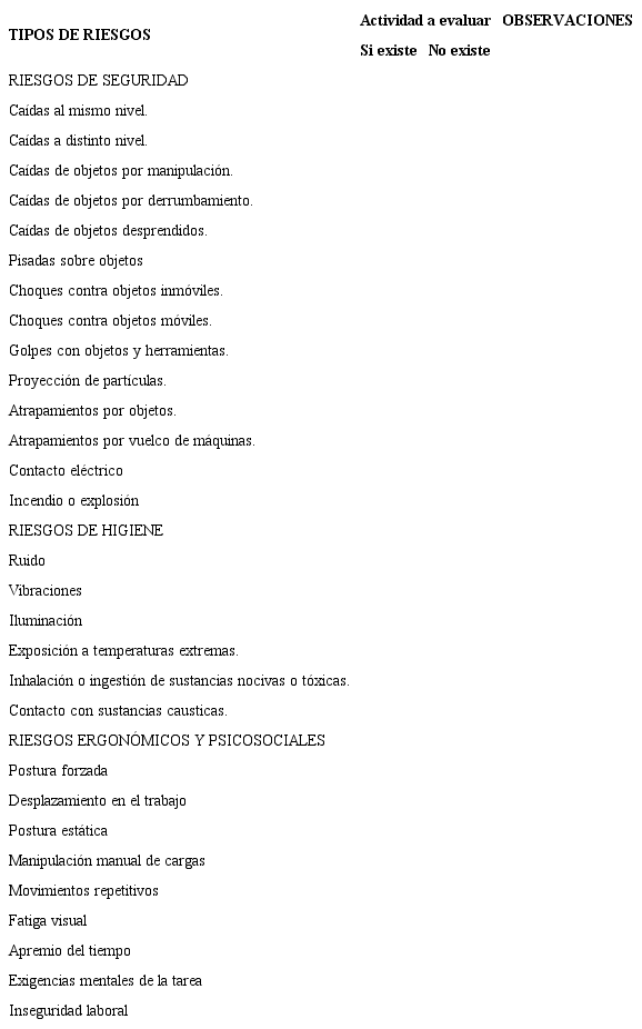 La lista de chequeo se aplicó al 100% de los trabajadores que desarrollan las actividades en la Compañía Agrícola Rodríguez y Asociados “Pitakawsay” y que se encuentran vinculados con las actividades seleccionadas. Los riesgos se organizan en tres grupos que tienen en cuenta los riesgos de seguridad, higiene, ergonómicos y psicosociales (tabla 1). El objetivo es identificar cuáles son los riesgos presentes en cada área de trabajo.