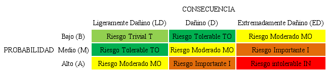 Para realizar la evaluación de los riesgos laborales se siguió la metodología propuesta por el Instituto Nacional de Seguridad e Higiene del Trabajo (INSHT). La metodología permite estimar el nivel riesgo considerando la probabilidad de ocurrencia y las consecuencias (Tabla 2)