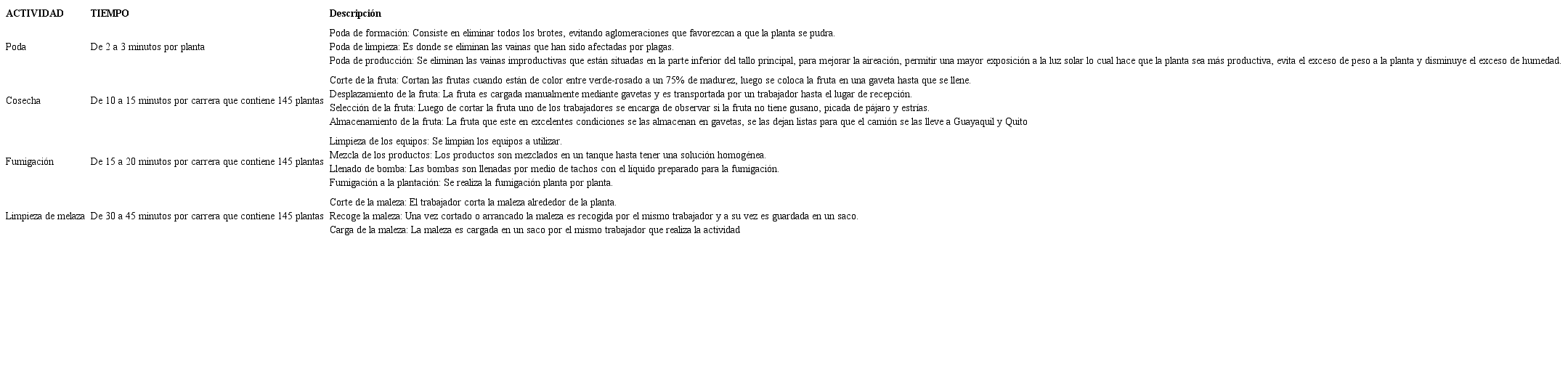 El cultivo de la Pitahaya tiene cuatro actividades fundamentales. En cada una de estas actividades se realizan diferentes sub-tareas que permiten obtener resultados productivos en la compañía Pitakawsay. Los trabajadores laboran 8 horas diarias, por la mañana desde las 6H30 am hasta las 11H30 am y por la tarde desde 1H30 pm hasta las 4H30 pm. Un estudio del estándar del tiempo, mediante el cronometraje de operaciones y elementos permitió estimar el tiempo estándar de cada actividad, los mismos se exponen en la tabla 3, así como una descripción de las sub tareas en cada una de las actividades principales.