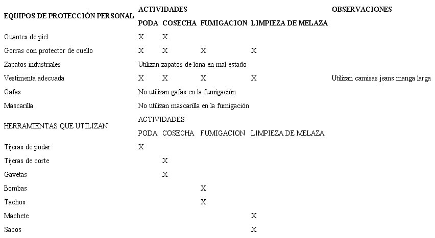 Para desarrollar las actividades en el cultivo de la Pitahaya, son necesarios un conjunto de equipos de protección personal y diferentes herramientas en diferentes estados o situación que perjudican a los trabajadores. Una relación de los mismos se muestra en la tabla 4.