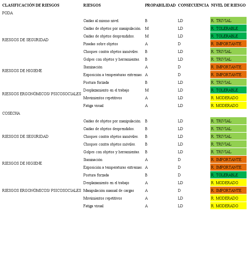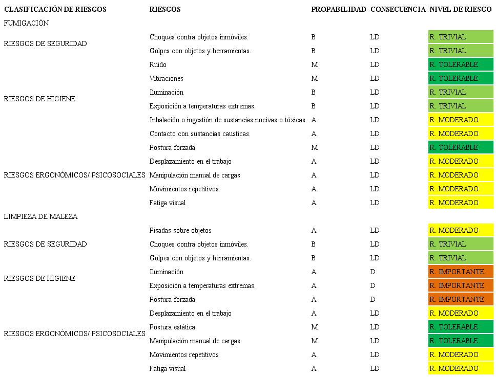 NRi- Nivel de riesgo encontrado en la actividad i (en el caso de la investigación se consideran la poda, cosecha, fumigación y limpieza de maleza)P- Probabilidad de ocurrencia del riesgo en la actividad i asumida como baja, media, altaC- Consecuencia de materializarse el riesgo en la actividad i, expresado en Ligeramente dañino, dañino y extremadamente dañino.Una vez obtenido las valoraciones de la probabilidad de ocurrencia y las consecuencias se proceden a calcular el nivel de riesgo mediante la ecuación 1. En la tabla 2, se muestra los resultados de la valoración cuantitativa del nivel de riesgo determinado.
