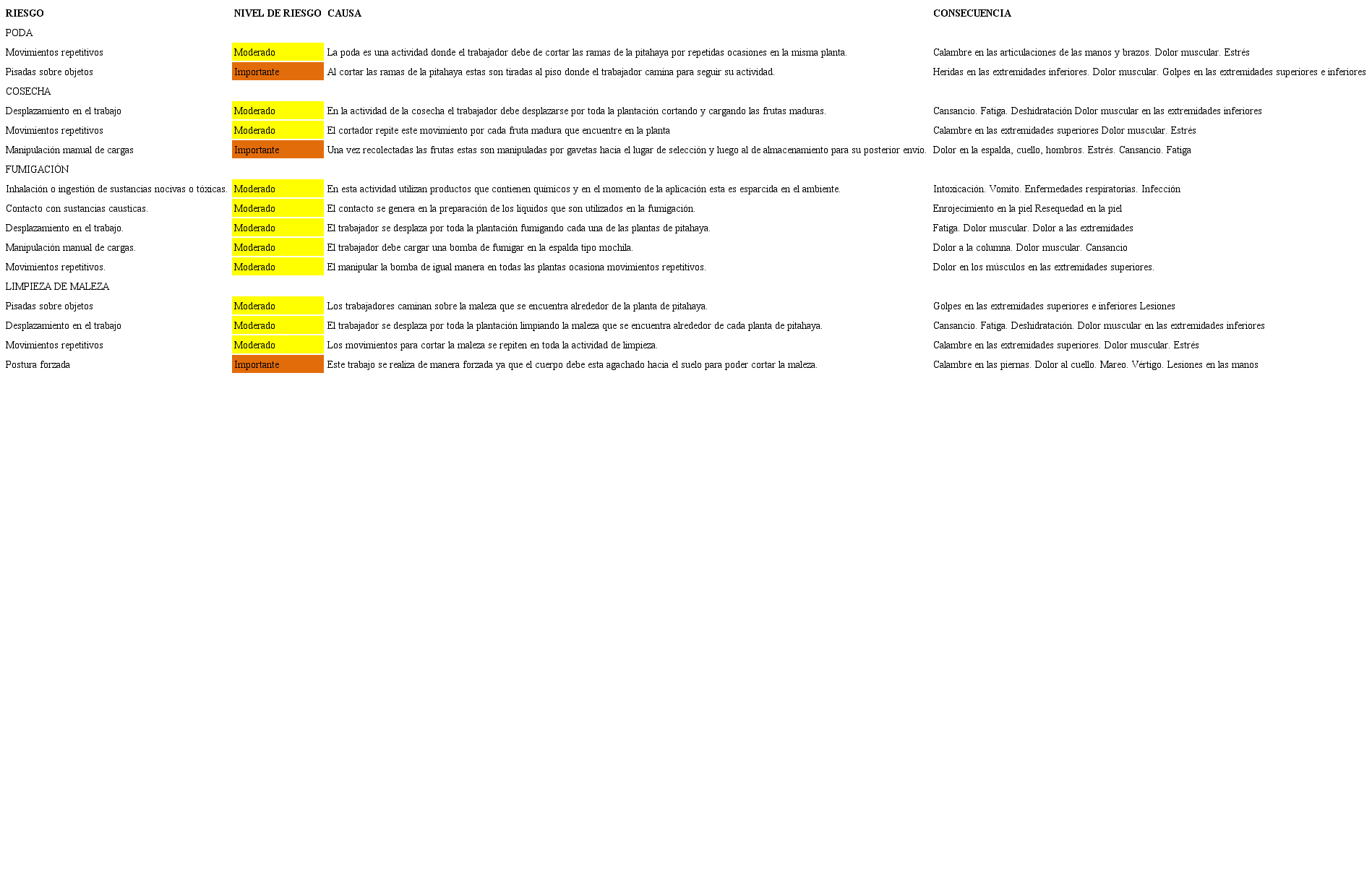 En la tabla 7, se presenta una matriz donde se exponen cada uno de los riesgos a los que se exponen los trabajadores en el cultivo de la pitahaya, manifestando en función de la evaluación de riesgo realizada el nivel de riesgo, presentando las causas y las consecuencias de esta exposición.