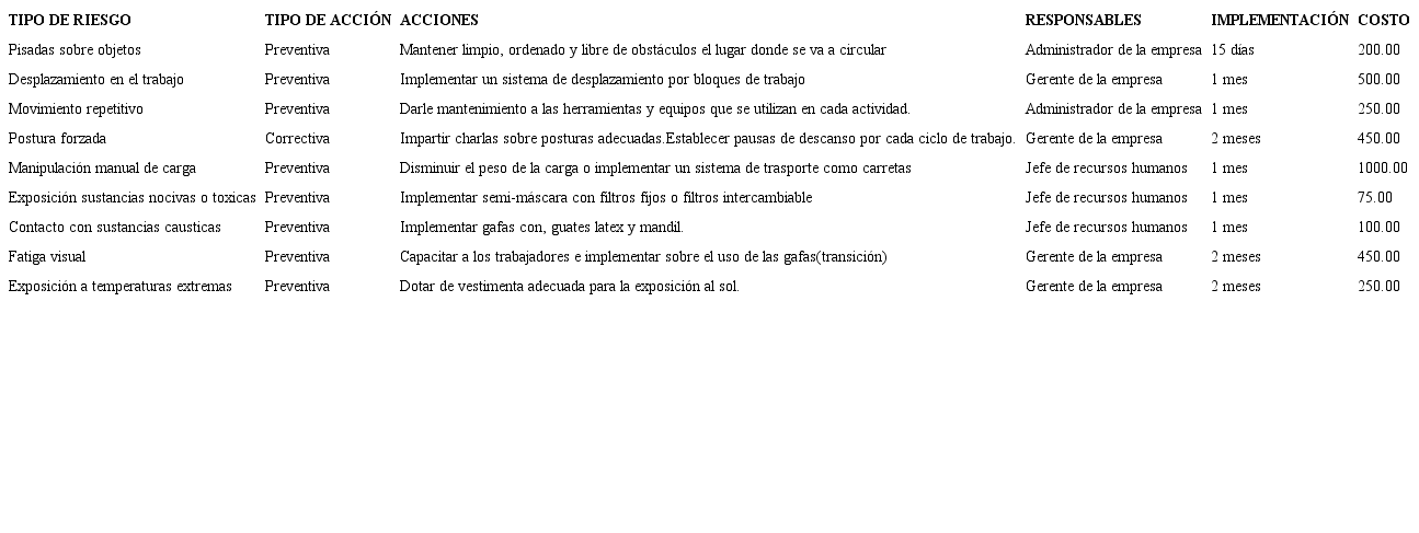 Los elementos que son considerados en el Plan de prevención de riesgos laborales debe considerar cada una de las acciones para eliminar el riesgo en su origen o minimizar su efecto, planteando en cada uno las acciones concretas a implementar, definiendo el responsable de implementación, el tiempo de ejecución y el costo. En la tabla 8 , se presenta la propuesta realizada a la compañía Pitakawsay.