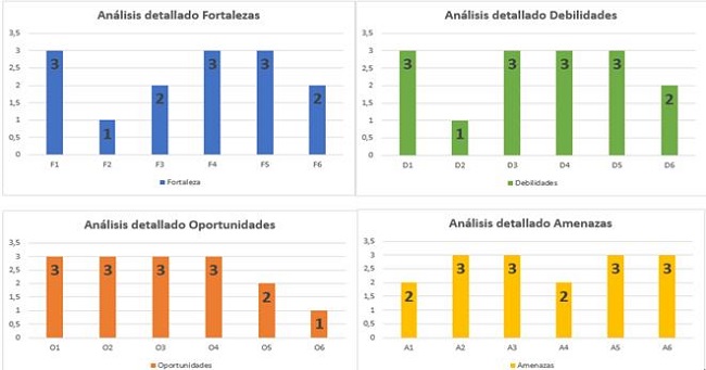 Para analizar la situación de la dirección que permita obtener datos de salida se identifican las fortalezas, debilidades, amenazas y oportunidades. Con la realización de una tormenta de ideas con los miembros de la DI, donde se seleccionaron las variables externas e internas que son pertinentes para su propósito se elaboró la matriz DAFO. La ponderación utilizada (3: alto nivel de actuación, 2: nivel medio de actuación y 1: nivel bajo de actuación) para cada variable se basa en los criterios y la influencia de las variables en el cumplimiento de los objetivos de trabajo.