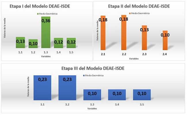 Con el objetivo de identificar las brechas de desempeño de las variables 1.1 Equipo estratégico (EE), 1.2 Comunicación entre actores internos y externos (CEA), 1.3 Rumbo estratégico (RE), 1.4 Diagnóstico, diseño y rediseño de los procesos claves (DDRPC), 1.5 Diagnóstico, diseño y rediseño de los procesos funcionales (DDRPF), 2.1 Dimensión estratégica del negocio (DEN), 2.2 Dimensión estratégica de la información (DEI), 2.3 Dimensión estratégica de las aplicaciones informáticas, 2.4 Dimensión estratégica de la infraestructura tecnológica (DEIT), 3.1 Liderazgo de la Dirección (LD), 3.2 Asimilación de los cambios por los trabajadores (ACT), 3.3 Gestión de indicadores de eficiencia y eficacia (GIN), 3.4 Integración de las TI-procesos-objetivos estratégicos (IPO) y 3.5 Generación de valor (V); se aplica la lista de chequeo del modelo DEAE-ISDE a los trabajadores y dirigentes de la DI y se detectan las principales dificultades del proceso de dirección estratégica. Los resultados obtenidos se observan en la figura 3.
