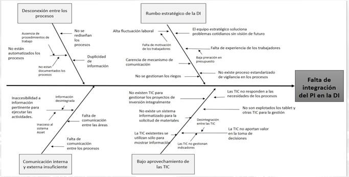 En la figura que se presenta a continuación se diagraman las problemáticas identificadas durante el diagnóstico de la Dirección de Inversiones, las cuales provocan el bajo nivel de integración calculados a través de los indicadores NISDE y NISDE-TI. Para ello se utiliza como herramienta el diagrama Ishikawa.