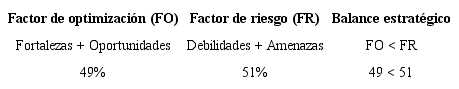 La DI presenta un balance estratégico ligeramente desfavorable hacia las debilidades y amenazas, las cuales representan un 51% contra las oportunidades y fortalezas de un 49%, lo que supone un factor de riesgo muy alto en conjunto, y por tanto se debe centrar más atención en este aspecto de la DI para que las medidas que se propongan contribuyan a su modificación en el corto plazo. De manera específica se tienen aspectos favorables y desfavorables, aprovechables y de riesgo.