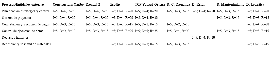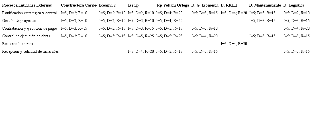 El valor de 0.281 no es bueno para la DI, debido a que las relaciones críticas encontradas han sido entre los procesos clave y todas las entidades externas seleccionadas menos 2 (DG. RRHH y TCP Yohani Ortega). La utilización de correo electrónico como principal vía de comunicación, y el procesamiento en tablas Excel de la información relevante de estos procesos, es nocivo para la DI debido a que se toman decisiones en los cronogramas de ejecución de las obras y los pagos a los proveedores basados en datos con un alto nivel de riesgo e incertidumbre.