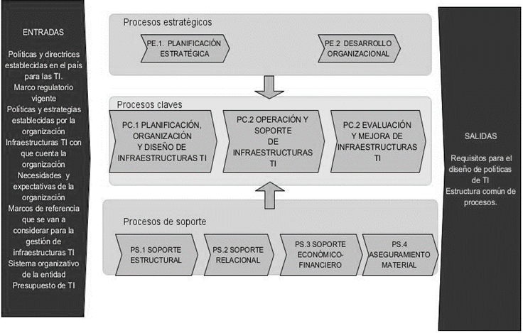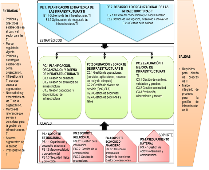 El proceso de Planificación estratégica de las infraestructuras TI, abarca el Gobierno de la TI implicando los seis principios establecidos por las ISO 38500, así como las tareas claves de gobierno corporativo. Dentro de este proceso se planificarán los niveles de riesgos que, a través de las TI, se inducirán a la organización como resultado del subproceso Optimización de riesgos de las infraestructuras TI. Finalmente, en los procesos de soporte se han considerado cuatro: el Soporte estructural, el Soporte relacional, el Soporte económico financiero y el Aseguramiento material.