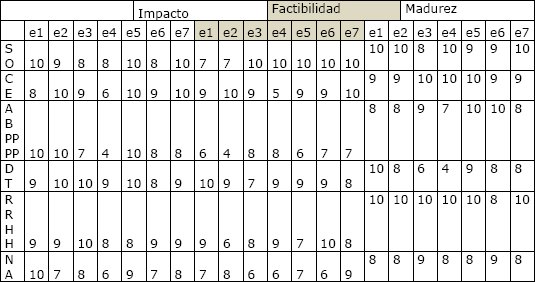 Para comprobar la factibilidad del procedimiento antes descrito,se aplicó el mismo en la Universidad de las Ciencias Informáticas, para lo cual se aplicó un instrumento a un grupo de siete expertos. Como resultado se obtuvo la matriz de impacto, factibilidad y madurez que se observa en la tabla 1.