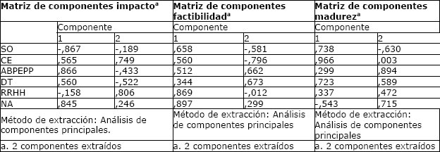 Se calculó el coeficiente de correlación de Spearman, obteniéndose una significancia menor que 0.05, de ahí que se puede aceptar la hipótesis de dependencia. Se procede a reducir las variables analizando la tabla de varianza acumulada. Una vez validada la hipótesis de dependencia, se procede a reducir las variables utilizando el método de Factorización de Ejes Principales (FEP) para identificar las capacidades más significativas en la UCI, cuyos resultados se representan la tabla 2 para la evaluación de impacto, factibilidad y madurez respectivamente.