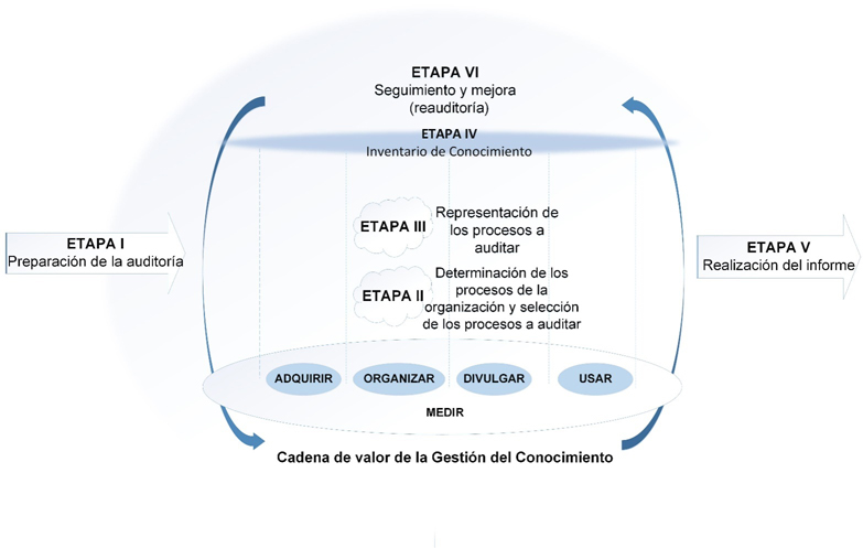 La literatura reconoce numerosas metodologías y procedimientos para la AGC. Del estudio realizado por Medina Nogueira, Yuly Esther et al. [9] a 28 procederes, se concluye que la mayoría son patrimonio de instituciones consultoras o empresas que cobran por ese servicio y no muestran, de forma explícita, cómo realizarlas y evaluar los procesos de la GC (adquirir, organizar, divulgar, usar, medir[10])1. Adicionalmente, queda manifiesta la necesidad de que la propuesta que se emplee esté sustentada en los procesos de la GC, en la mejora continua, el enfoque de procesos y el trabajo en equipo, con el propósito de incidir en la cultura de la organización. El esquema que representa la metodología resultante para el desarrollo de la AGC se muestra en la figura 1.