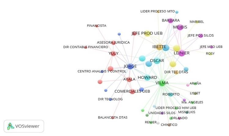 La figura 4 muestra el análisis clúster de un ARS realizado por Medina Nogueira, Yuly Esther et al.en una empresa del territorio nacional cubano en la que se destaca, a modo de ejemplo, que el ARS se realiza a 54 actores los que forman 18 clúster [16]. Esta información es obtenida como resultado de la corrida del software UCINET 6.0.