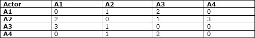 La tabla 2 representa la matriz de adyacencia modificada que muestra la relación de las tareas que realiza cada actor respecto al total de sus tareas con cada uno de los actores restantes de la red, a partir de una escala Likert de 0 a 3. El valor cero se asocia a la ausencia de relación; uno a una baja; dos a una media y tres a una relación alta. Se recomienda la formalización de estos pesos de intensidad de la manera siguiente: cero si no presenta ninguna relación con el actor, uno si realiza del 1 al 20 % de sus tareas con el actor; dos si es del 21 al 50 % de estas y tres 3 si más del 50 % de sus tareas las realiza con el actor mencionado.