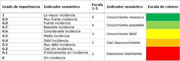 Como resultado del ARS se propone la evaluación del conocimiento existente al actor de la red seleccionado: a través de mapas de conocimiento basados en escalas de colores desarrollados a partir de la inclusión del conocimiento en el método DACUM (Develop A CUrriculuM) [18]. Para determinar el conocimiento existente en un actor, en correspondencia con el conocimiento necesario. Se recomienda realizar un mapa de conocimiento según la escala de colores planteada en el cuadro 2. Dicho mapa debe desarrollarse con el actor a evaluar y los actores con mayor grado de cercanía con este, determinados a partir del ARS.