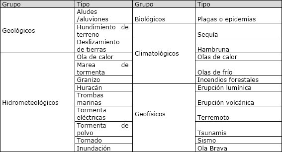 Los tipos de peligros de la tabla1 fueron algunos de los eventos de desastres que han provocando miles de pérdidas de vida humana, económicas y ambientales, en los últimos años América Latina y el Caribe.