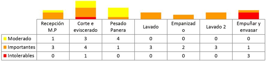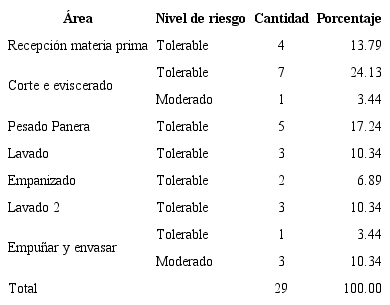 Al analizar los riesgos por áreas y niveles, la figura 2 muestra que los riesgos de mayor consideración se detectaron en el proceso de corte y eviscerado (1) y en el área de empuñado y envasado, los cuales por su clasificación de intolerables demandaron una acción inmediata para poder continuar con las operaciones según lo establecido en el artículo 63 de la ley N° 29783.
