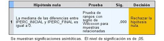 Análisis inferencial: En concordancia con el diseño preexperimental establecido, se definió como hipótesis de trabajo que: la mediana de las diferencias entre el nivel de riesgo inicial y el nivel del riesgo final no es igual a 0. Mientras que la hipótesis nula fue: la mediana de las diferencias entre el nivel de riesgo inicial y el nivel de riesgo final es igual a 0. Para la comprobación estadística, ya que los datos tenían una escala ordinal, se utilizó una prueba de rangos con signo de Wilcoxon para muestras relacionadas, con un nivel de confianza del 95% y una significancia (α) de 0.05. Esta metodología se escogió para establecer que la disminución de riesgos era significativa, es decir, que el estudio no debía determinar una postura basada en un promedio simple de las puntuaciones obtenidas, sino que el por contrario se debería tomar en cuenta la naturaleza y variabilidad de los datos.