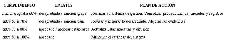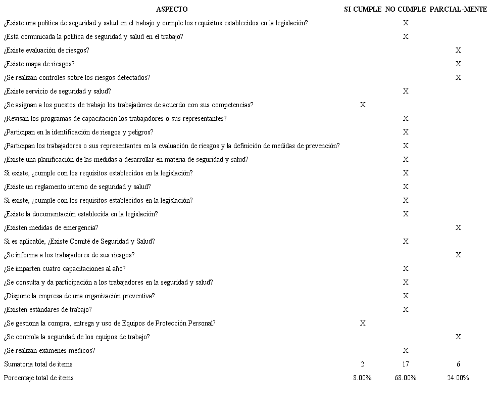 Análisis de Línea base: La Ley N° 29783, en su artículo 37, establece que, para iniciar el sistema de gestión en seguridad y salud en el trabajo, previamente, debe realizarse un análisis de línea base donde se determine el nivel de cumplimiento de la normatividad legal. Para ello, se empleó una lista de comprobación con 25 interrogantes y con una escala ordinal estableciendo si la empresa cumplía los requisitos de la ley, no los cumplía o los cumplía parcialmente. El plan de acción dependió del nivel de cumplimiento, como se observa en la tabla 1.