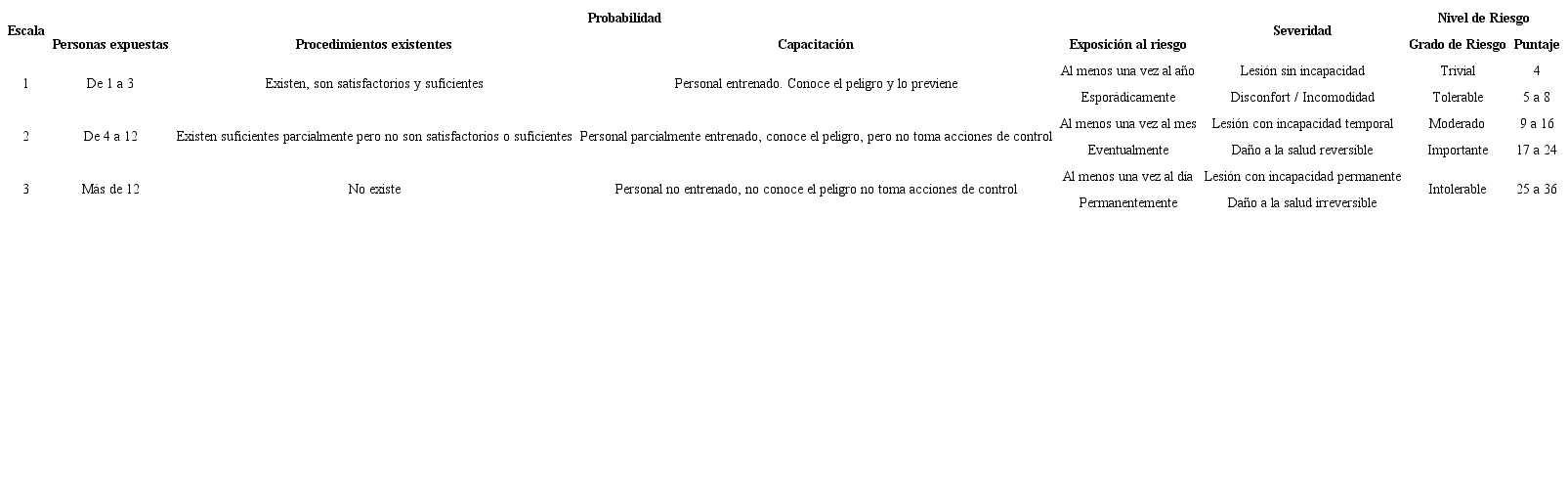 Identificación de peligros y evaluación de riesgos mediante una matriz IPERC: El riesgo se define como una combinación de la probabilidad de daño y la gravedad de sus consecuencias (Moatari, Chinniah & Agard, 2015) [13]; mientras que la evaluación de riesgos enmarca un estudio técnico (Callizo, 2015) [14]. En ese sentido, se utilizó el método establecido por el Ministerio de Trabajo y Promoción del Empleo (2013) para calcular el nivel de riesgo en una escala ordinal a partir de la multiplicación del nivel de probabilidad por la severidad. Donde el nivel de probabilidad fue el resultado de la suma de: el número de personas expuestas, procedimientos existentes, capacitación y exposición al riesgo [15].