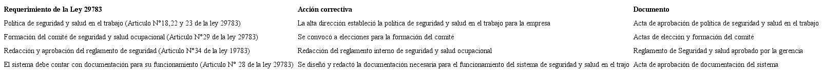 En la tabla 4, se puede observar que las acciones correctivas respecto a los procedimientos administrativos incluyeron: la implementación de la política de seguridad y salud, la convocatoria de elecciones para la formación del comité, redacción del reglamento interno de seguridad y salud en el trabajo y la redacción de la documentación necesaria para el funcionamiento del sistema de seguridad y salud en el trabajo.