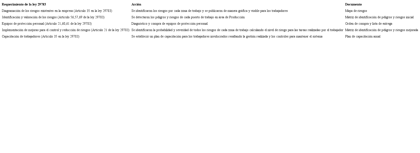 Implementación del sistema de seguridad y salud en el trabajo: Para la etapa de diseño se tomó en cuenta los requisitos críticos establecidos en la ley N° 29783 y su reglamento respectivo publicado a través del Decreto Supremo Nº 005-2012-TR [16]. Entre dichos requisitos se puede mencionar: la formación de un comité de seguridad en el trabajo, un reglamento interno de seguridad y salud, entre otros documentos para el funcionamiento del sistema. Entre las acciones de control, la normatividad establece que el empleador debe: identificar los peligros y evaluar los riesgos para la seguridad y salud de los trabajadores en forma periódica, capacitar a los trabajadores, entrega de equipos de protección personal (EPP), entre otras.