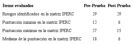 Para poder realizar la comprobación de hipótesis respecto a que la implementación del sistema de seguridad y salud en el trabajo redujo los riesgos laborales en la empresa pesquera, se procedió a cuantificar solo los riesgos identificados según su puntuación en la matriz IPERC. La Tabla 7, muestra que la puntuación media paso de 18 a 6, lo cual representaba una reducción del 67%.