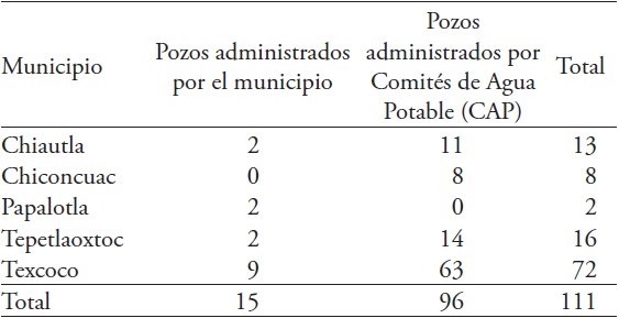 El Valle de Texcoco enfrenta problemas de administración del acuífero y de administración de las redes de agua. El abasto de agua potable proviene mayormente de pozos; sin embargo, el acuífero del Valle de Texcoco se considera uno de los más sobrexplotados del país (CONAGUA, 2012); esto significa que la extracción del agua subterránea supera al volumen de recarga media anual. Solo en el municipio de Texcoco existen 312 pozos profundos, de los cuales 74 pozos (24 %) se destinan a usos urbanos; de éstos, nueve se encuentran en la cabecera municipal y son administrados directamente por el H. Ayuntamiento. El volumen de extracción de los pozos administrados por el municipio asciende a 244 944 m3 por día (Tavarez et al. 2010).