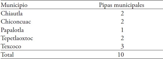 La mayor parte del servicio por pipas es privado. Sin embargo, algunos municipios cuentan con pipas para contingencias (fallo en la red, daño del equipo del pozo profundo). En el municipio de Texcoco muy recientemente, y en paralelo a la creación de la Subdirección de Agua Potable y Alcantarillado, el ayuntamiento empezó a suministrar agua por pipas a viviendas de asentamientos del municipio que tienen fallas en la red de agua potable o se encuentran fuera de dicha red (escuelas e iglesias). De los cinco municipios en estudio todos cuentan con al menos una pipa, ya sea para dar servicio a parques, jardines, camellones o contingencias, y realizan entregas a las localidades que lo soliciten en las oficinas del municipio correspondiente y, en algunos casos, cuando las solicitudes sobrepasan la capacidad del municipio, solicitan apoyo de los municipios aledaños o tienen acuerdos con piperos particulares para poder brindar servicio a todas las localidades que acuden al municipio a solicitar el apoyo, con un costo promedio de $200 por viaje de 10 000 litros. Sin embargo esta oferta se ve sobrepasada por la demanda del servicio de las localidades que lo solicitan semanalmente.
