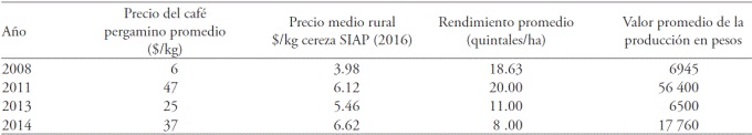 La disposición de capital financiero permite conseguir tierra, herramientas, insumos, alimentos, y satisfactores de las necesidades básicas de salud, educación y vestido. Si el gobierno entrega el apoyo en especie, éste se vende para adquirir lo que realmente requiere el productor, por tanto la función del gestor del linaje tiene como objetivo principal la negociación con el gobierno. Para el año 2008 la comunidad de El Tzay se encontraba en una condición de pobreza alimentaria y era fuertemente dependiente de las trasferencias gubernamentales y la migración para su sostenimiento (Ramos et al., 2009). Los ingresos en los cinco últimos años por venta de café (Cuadro 1) han mostrado una tendencia a la alza; para 2014 el rendimiento bajó y el precio aumentó por problemas de broca; se considera que para 2015 los rendimientos se verán disminuidos.