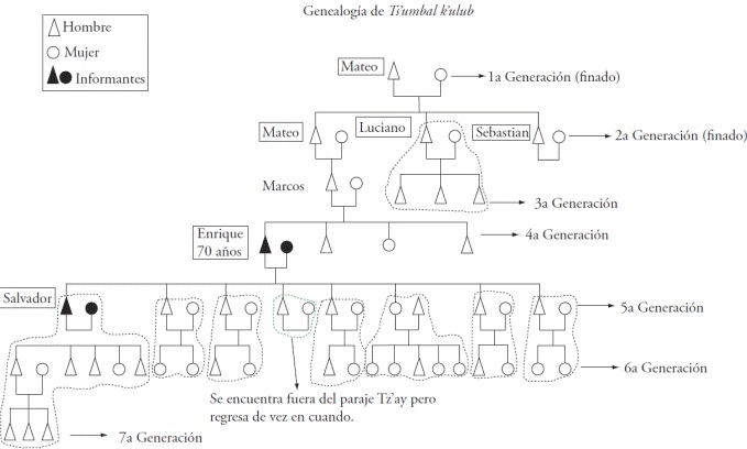 El linaje k ́ulub ha reproducido su sistema social mediante la formación de nuevas familias, como se observa en la siguiente genealogía reportada por Gómez (2011). Según dicho autor, tres miembros3 de Ts’umbal K’ulub mencionaron que hace más de 100 años existieron de tres a cuatro Mamaletik (ancestros) ‘mayores de edad’ que llegaron a poblar el paraje Tzay. Esto nos indica que el Ts’umbal K’ulub no proviene de un Wol naj sino de varios Wol naj (Un Wol naj está integrado por una pareja, hombre y mujer, y los hijos(as); así entonces, no provienen de un mismo ancestro aunque comparten el apellido en la lengua Tseltal y en español. Los miembros de este Ts’umbal son conocidos como los K’ulubetik en Tseltal, o los Gómez en español, y ésto los identifica respecto de otro Ts’umbal dentro y fuera del paraje El Tzay (Figura 2).