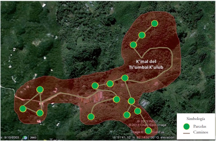 En términos generales la extensión del K’inal de los K’ulubetik, según don Manuel K’ulub de 80 años, quien vive en la cabecera municipal, suma un total de 600 ha (Gómez 2011). El K’inal se ubica entre los 1300 a 1400 m, por lo que se caracteriza como zona templada (K’ixin K’inal en la lengua tzeltal). Actualmente la tierra se ha fraccionado y los integrantes de la 5a y 6a generación del Ts ́umbal k ́ulub se han apropiado el territorio, fraccionándolo y dando diversos usos al suelo. Este es el espacio de acción del Wolwanej (Figura 3).