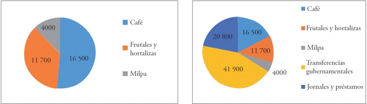 Por otra parte el enfoque asistencial permite a las familias tener ingresos anuales por transferencias gubernamentales que oscilan, para el caso de linaje k ́ulub, entre 40 % y 50 %. Esta dependencia se refleja en una fuerte inversión de tiempo del Wolwanej para gestionar todos los recursos y apoyos sociales posibles como OPORTUNIDADES, PROCAMPO, compensación al precio del café, entre otros. Así entonces, el enfoque asistencial, aunque intenta paliar el problema alimentario, no lo resuelve y sí, en cambio, promueve la dependencia.