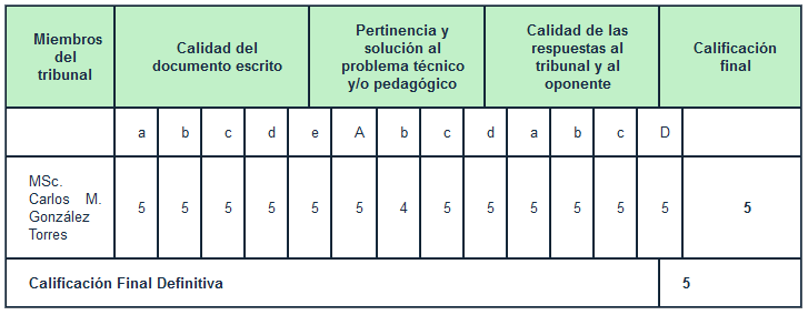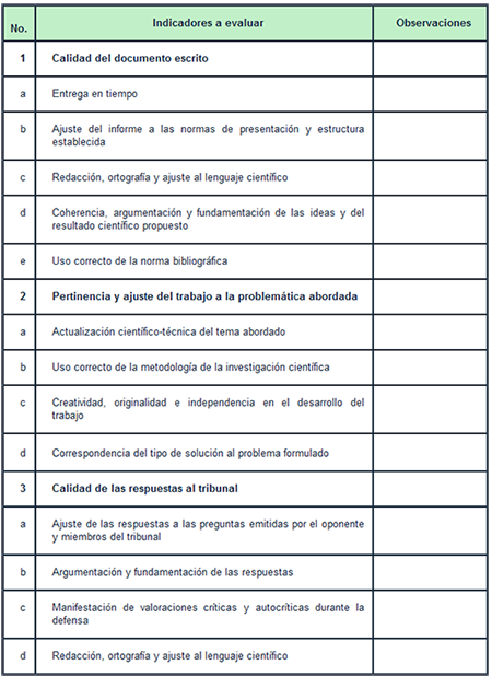 El plazo establecido para este proceso es de tres días, a partir del cual, los miembros del tribunal envían un acta al presidente del tribunal cuyo modelo fue elaborado para este fin, de forma tal que permitiera emitir de forma oficial las consideraciones y evaluación final del trabajo, teniendo en cuenta las respuestas ofrecidas a sus preguntas. Tabla 2.