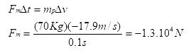 1.6 Un pasajero de 70 kg que va en un automóvil participa en un choque de frente a 17.9 m/s (60 km/h) con una barrera de concreto. Si se supone que el tiempo de frenado es de 100ms, calcule la fuerza que ejerce el cinturón de seguridad y la banda del hombro sobre la persona.