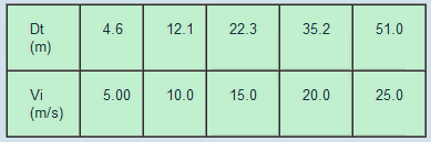 1.2. Dada la tabla de distancia recorrida en función del valor de la velocidad inicial de un auto. Determina el tiempo de reacción del chofer y la aceleración del auto.