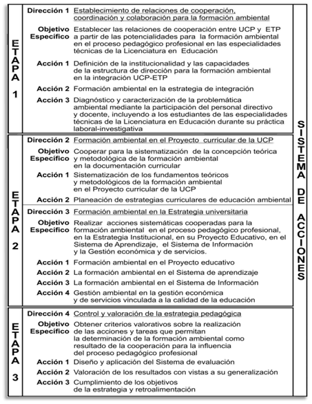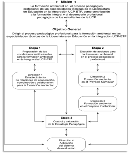 Tomando como referentes a Sierra RA. (2002), Gómez DE. (2009), Deliz O. (2010), Merino T. (2010), Osorio A. (2012), la estrategia pedagógica se asume como una concepción teórico-práctica de la dirección del proceso pedagógico profesional, para la formación ambiental de los estudiantes en las especialidades técnicas de la Licenciatura en Educación, que se manifieste en lo personal, profesional, grupal e institucional como contribución al desarrollo sostenible (13-17).