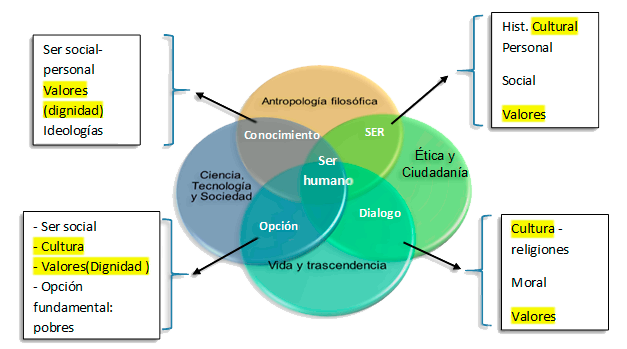 La Antropología Filosófica trata a lo largo de sus cuatro capítulos al ser humano como un ser histórico-cultural, un ser integral, un ser en relación con Dios; unidades temáticas 2,3 y 4 respectivamente; este proceso de estudio le vincula a las comprensiones del capítulo 1 de la asignatura Vida y Trascendencia, donde se trata la dimensión trascendente del ser humano, los fundamentos antropológicos y culturales de esta experiencia. Se relacionan con la asignatura Ética y Ciudadanía en sus capítulos 2 y 3 que tratan la dimensión personal y la dimensión social de la ética y el capítulo 4 donde se aborda la dignidad del ser humano.