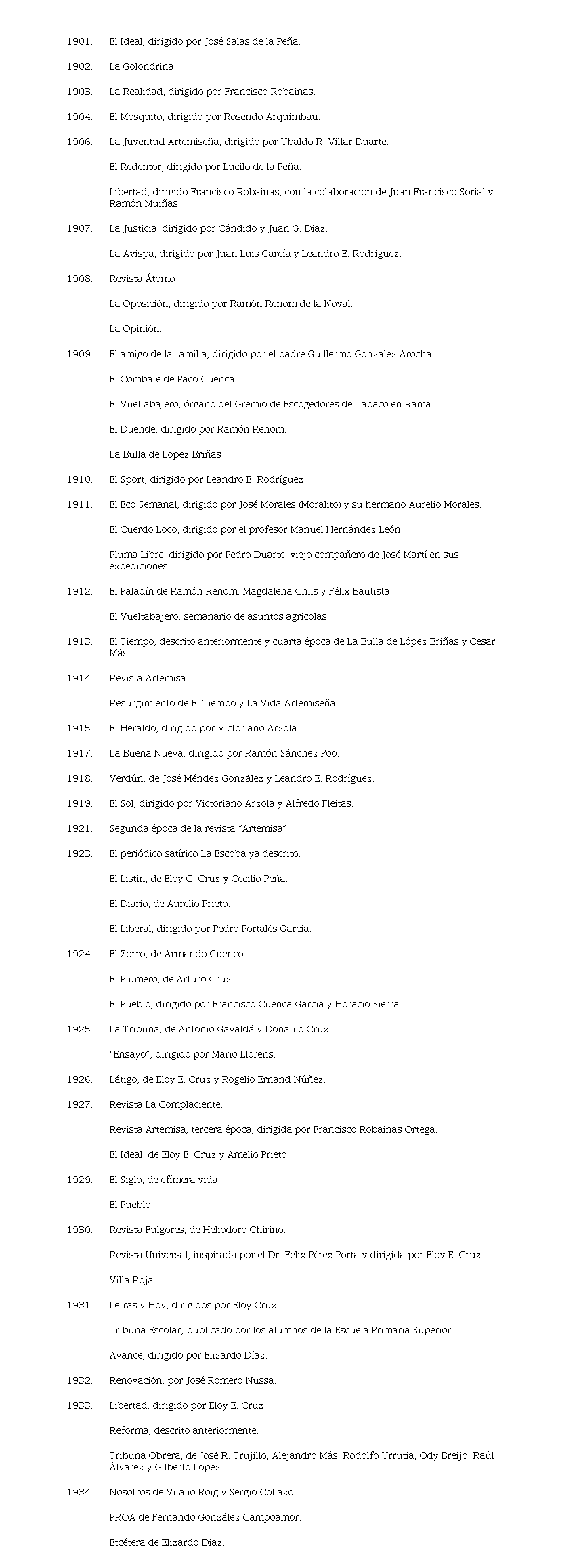 Relación de publicaciones periódicas y revistas editadas en Artemisa a partir de 1901 a 1934