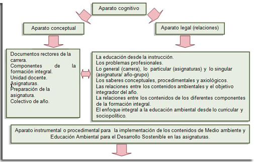 Trabajo metodológico Los aspectos esenciales del trabajo metodológico de las cuatro especialidades que se estudian en las escuelas pedagógicas: maestros primarios, educador de preescolar, maestros de educación especial y maestros de Inglés de Educación Primaria, tienen como principal objetivo contribuir a concretar la política del Estado en la formación de profesionales de la educación de nivel medio superior que laborarán con las primeras edades. Su trabajo metodológico está encaminado a mejorar continuamente la calidad del proceso de formación que ocurre en las escuelas pedagógicas como centros formadores de profesionales de la educación. Respecto al trabajo metodológico, en las orientaciones emitidas para la implementación del tratamiento al medio ambiente y educación ambiental para el desarrollo sostenible como componentes de la formación integral, se enfatiza el papel del colectivo pedagógico que orienta y diseña las acciones principales a tener en cuenta en los colectivos de asignaturas, unidades docentes y años. Una de estas acciones se relaciona con la preparación de las asignaturas; ello obliga de manera inmediata a pensar en el proceder: ¿Cómo implementar el tratamiento al medio ambiente y educación ambiental para el desarrollo sostenible de manera integrada desde la preparación de las asignaturas? Para la precisión de las indicaciones metodológicas se parte de un aparato cognitivo así como de un aparato instrumental o procedimental:
