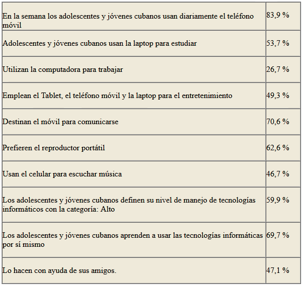Se manifiesta que el uso de las TICs en Cuba se ha convertido en algo indispensable para los jóvenes ya que más del 59.9 % considera que su habilidad para el uso de la tecnología es muy alta. Otro de los factores que propician la informatización de la sociedad en Cuba es la masificación del uso de computadoras refiere (Sosa López, 2009):