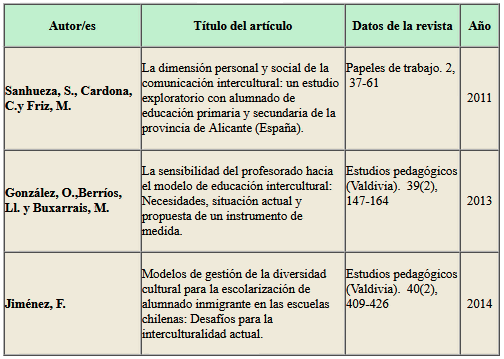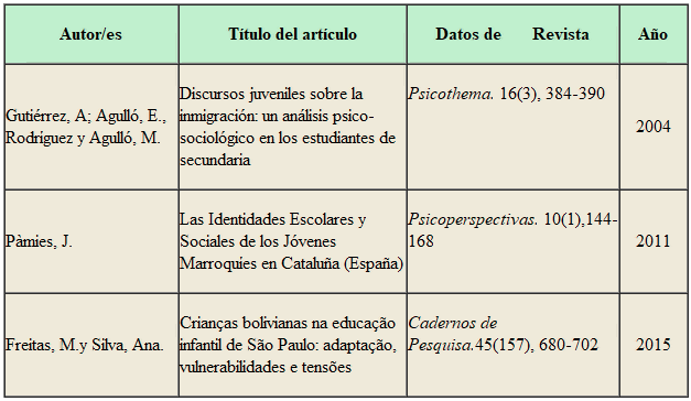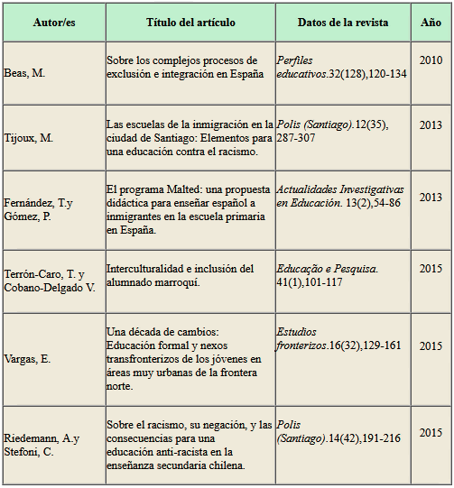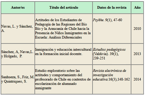 Los quince artículos que conforman el corpus se distribuyen en doce revistas, cuatro editadas en Chile, tres en México, dos en Brasil y figurando con una, España, Argentina y Costa Rica. Se añade también el dato que se observa una correspondencia entre país de realización de la investigación con el país de origen de la revista. Por ejemplo, de los seis estudios de inmigración desarrollados en Chile, solo uno está publicado en una revista mexicana. En cuanto a la recurrencia de las revistas, cinco de las investigaciones que conforman el corpus han sido publicadas en dos revistas chilenas, Estudios Pedagógicos (3 artículos) y Polis (2 artículos). La revista Estudios Pedagógicos (EPED), data del año 1976 y es publicada por Instituto de Ciencias de la Educación de la Facultad de Filosofía y Humanidades de la Universidad Austral de Chile. Los artículos son indizados o resumidos por, Scientific Electronic Library Online – Scielo y Scopus, entre otros índices. Por su parte, Polis. Revista Latinoamericana, es editada desde el año 2001 por el CISPO- (Centro de Investigación Sociedad y Políticas Públicas), de la Universidad de Los Lagos Campus Santiago (Chile). Las principales bases de datos en que está referenciada son: SciELO , Dialnet y Latindex . Uno de los artículos publicado en Polis, cuenta con la mayor cantidad de citaciones (4), perteneciente a Tijoux (2013) y titulado: “Las escuelas de la inmigración en la ciudad de Santiago: Elementos para una educación contra el racismo”. El segundo artículo más citado (3 veces), “Actitudes de los Estudiantes de Pedagogía de las Regiones del Bío-Bío y la Araucanía de Chile hacia la Presencia de Niños Inmigrantes en la Escuela: Análisis Diferenciales” de Navas y Sánchez (2010) está publicado en la revista chilena Psykhe.